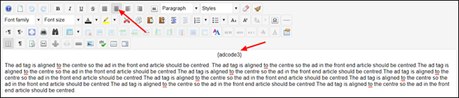 In the Joomla! backend article editor simply type in the tag {adcode1} anywhere in the article you want an ad to appear, you may also use the formatting options in the article editor such as aligning the ad to the left or right, you may also use formatting options in the ad code itself in the plugin backend.